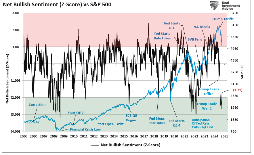 Furthermore, sentiment among both professional and retail investors has rebounded from its profoundly negative state, which is bringing buyers back into the market. Notably, that sentiment remains far from optimistic, providing further support for asset prices. The chart below shows the Z-score (standard deviation) of the net bullish sentiment of both retail and professional investors. Profoundly negative readings are often coincident with market lows.