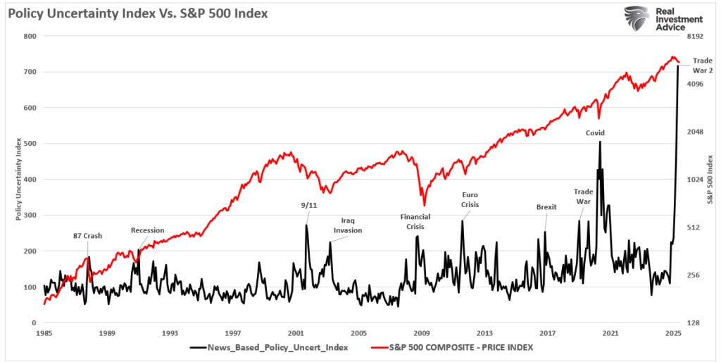 Retail investors seem to view the recent sharp correction as possibly finished. As I noted last week on X, despite the near 20% correction in the markets, retail investors piled into US equities at a record pace. Of course, historically, retail investors were considered a contrarian indicator, but in recent years, particularly post-pandemic, they have been aggressive buyers of any dip in the market. Of course, after 15 years of monetary and fiscal interventions to stave off deeper bear markets, their “buy the dip” mentality is unsurprising.