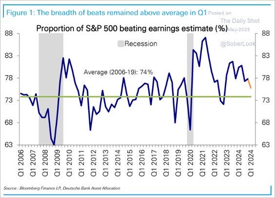 First, Q1 earnings delivered above-average results overall but were primarily driven by major technology companies and the AI-powered “Magnificent 7.” That cohort continues to provide the cornerstone for investor optimism. However, even though the largest capitalization-weighted companies delivered the bulk of earnings, the proportion of companies beating estimates remained well above the long-term average of 74%.