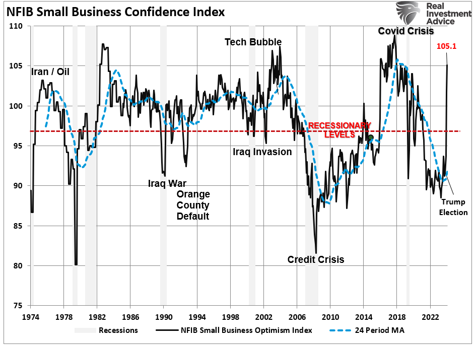 However, it isn’t just Wall Street analysts who are optimistic about 2025 returns. Retail investors are the most optimistic about higher stock prices in 2025 by the most on record. Unsurprisingly, that sentiment resulted in the psychological rush to overpay for assets, pushing forward 1-year valuations sharply higher.