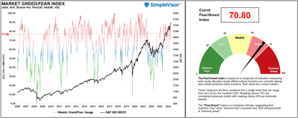 The “Fear/Greed” gauge is how individual and professional investors are “positioning” themselves in the market based on their equity exposure. From a contrarian position, the higher the allocation to equities, the more likely the market is closer to a correction than not. The gauge uses weekly closing data.