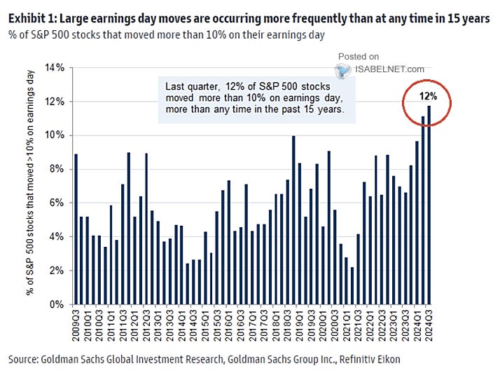 Of course, lowering the bar will generate a high “beat rate” by companies, which will help fuel stock prices in the short term. Q3 has seen the largest moves by stocks on earnings day than at any other point in the last 15 years.