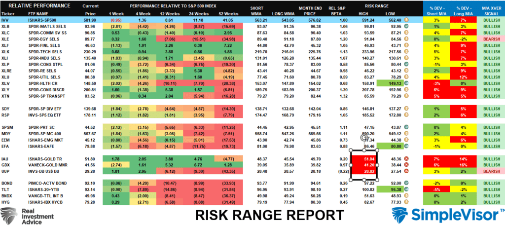 Last week, we noted that “the market is now due for a correction or pause over the next few weeks to relieve some extreme deviations from long-term means.” That correction began this week and relieved some of the market’s overbought condition. However, gold, gold miners, and the dollar remain overbought, with the former two extremely deviating from long-term means. While bullish, those deviations can’t be sustained long-term, so a consolidation or correction is likely. Bonds, International, and Healthcare, are oversold and on bullish crossovers, so these sectors will likely see counter-trend rallies soon.