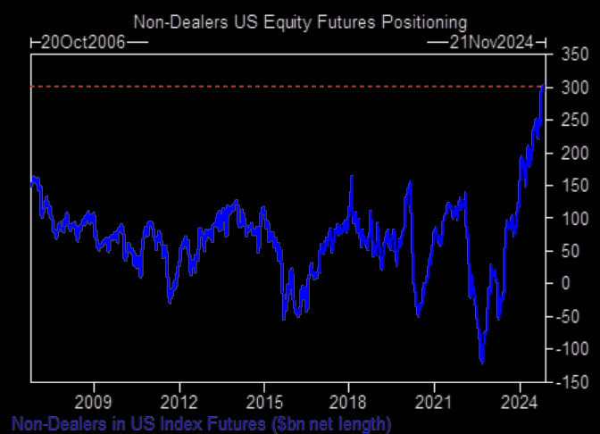 The first is that investor sentiment is once again very “greedy.” Both retail and institutional investors have been piling into equities this year despite rising levels of uncertainty. The chart below, courtesy of TheMarketEar, shows non-dealer US equity futures positioning. If this trend continues, there will need to be a bigger chart.