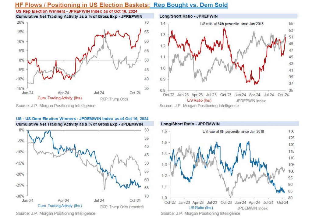 “As odds of a Trump presidency and Red Wave have increased over the past few weeks, we’ve seen themes that are perceived to be Republican Winners (JPREPWIN) outperform Democratic Winners (JPDEMWIN) by ~7% over the past month. Crypto stocks and small caps have performed better, while Renewables have underperformed. In addition, the wider US equity market continues to make new ATHs and positioning appears to be elevated. Based on the thematic shifts, historical returns around elections, and elevated positioning, there’s room for a bit of disappointment and reversal in coming weeks if odds start to shift the other way.“