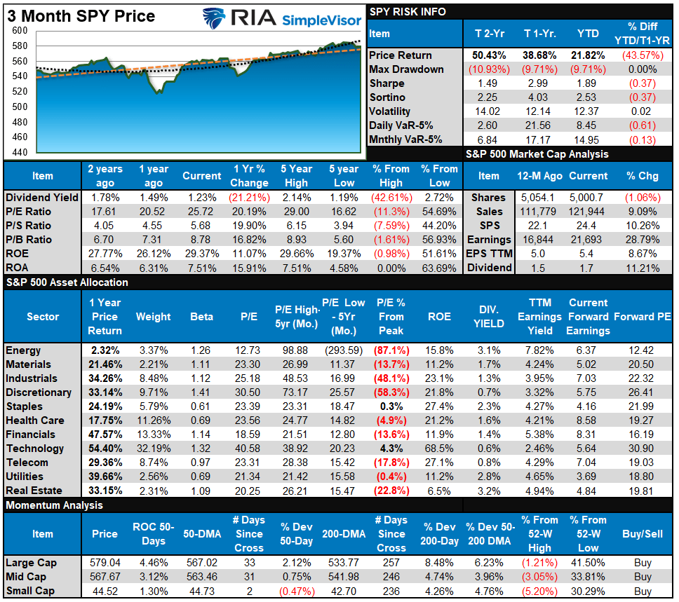 Last week, the overbought/sold analysis on the bottom left showed that the average and median stock were overbought, with the broad market and many sectors pushing for more extreme conditions. We noted that such a setup allows the market to “rest” briefly before moving higher into year-end. This past week, the market took a break and retested the 20-DMA. While the bullish bias remains, this consolidation phase could last through next week and into the election. However, we suggest using the current “pause” to rebalance portfolios for a post-election advance into year-end, assuming the outcome is not a “highly contested mess,” which may muck things up.