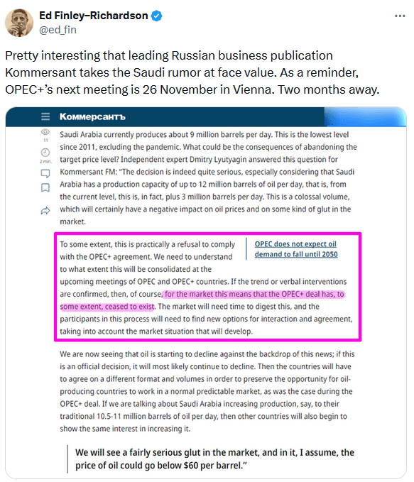 A reader brought the following tweet from @ed_fin to our attention yesterday. Ed clipped a Russian news article that states that Saudi Arabia is not complying with OPEC target price agreements. It argues that Saudi Arabia, OPEC’s de facto leader, should be cutting oil production more aggressively. The author further states that the OPEC+ deal no longer exists. Therefore, if this is true, and that is very debatable, OPEC may have trouble reigning in production against the backdrop of weakening demand. Such could cause the oil price to push oil to $60 or below. The graph below shows that crude oil prices recently bearishly broke out of a wedge pattern. The horizontal support line is critical for oil prices to hold. If it trades below the line, the author may prove correct.