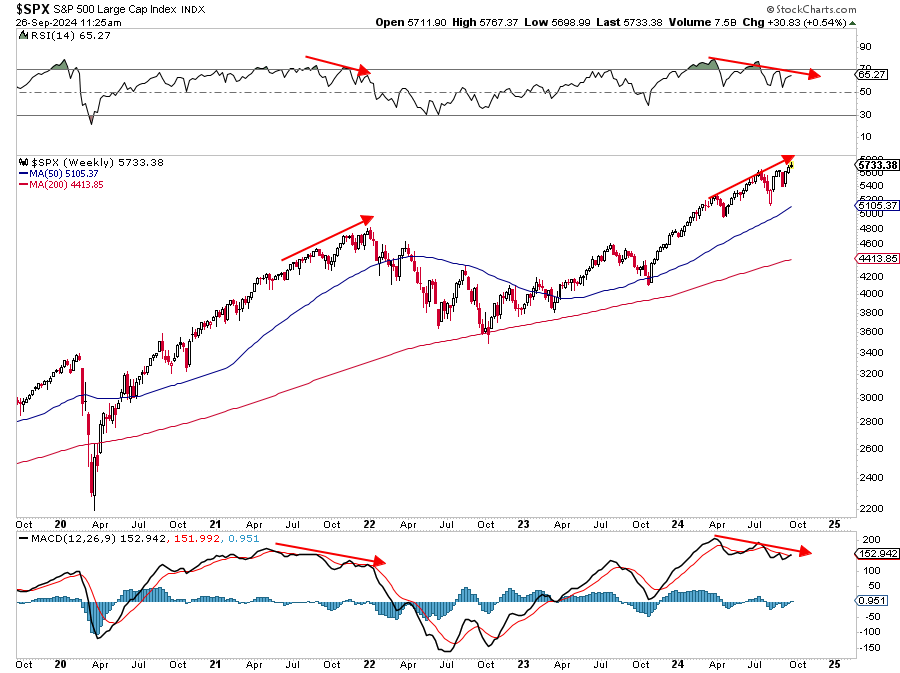 Yesterday, we discussed the short-term bullish “cup and handle” technical formation, which suggests higher prices in the near term. While the case remains today, there is a reason to question the potential magnitude of those gains as we approach year-end. As I discussed yesterday morning, the WEEKLY chart of the S&P 500 index has two concerning technical issues worth watching.