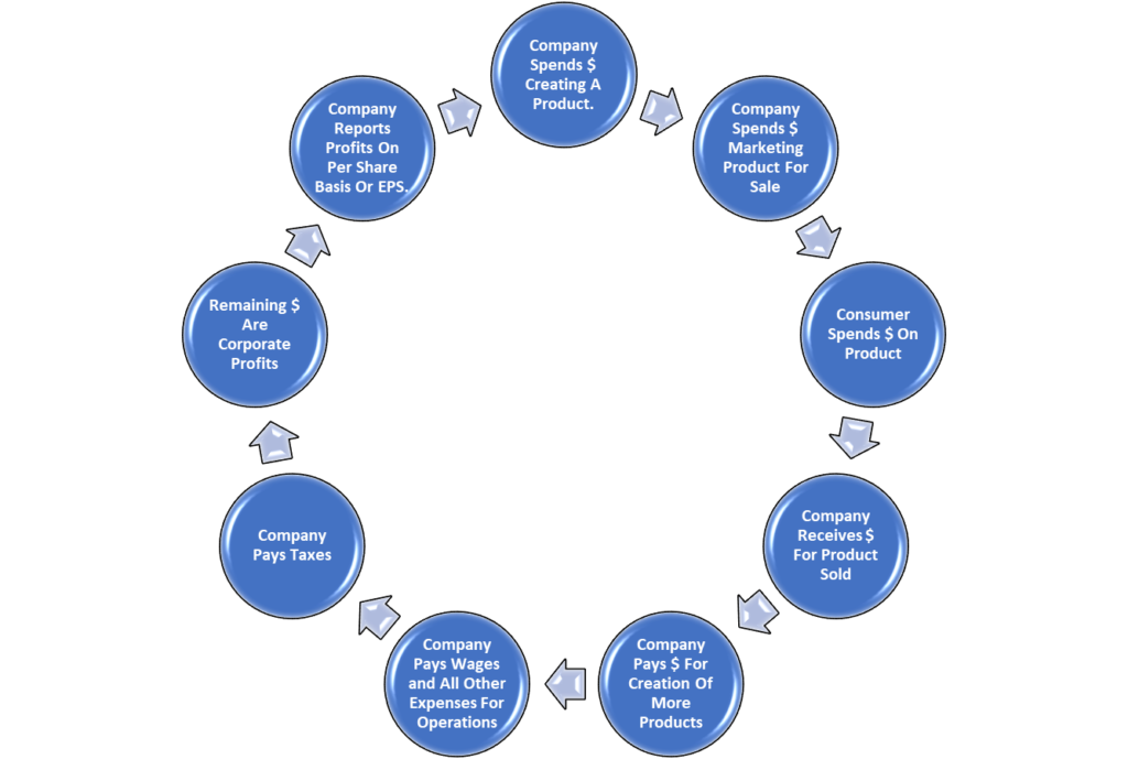 With that understanding, we must return our focus to the first line item—net sales (aka revenue, sales, gross sales, etc.). A company must sell a product or service to customers to generate revenue. The basic diagram below shows a company’s revenue cycle. Therefore, to understand what to expect in terms of future, or forward, earnings with some degree of accuracy, we must understand the direction of consumer spending.