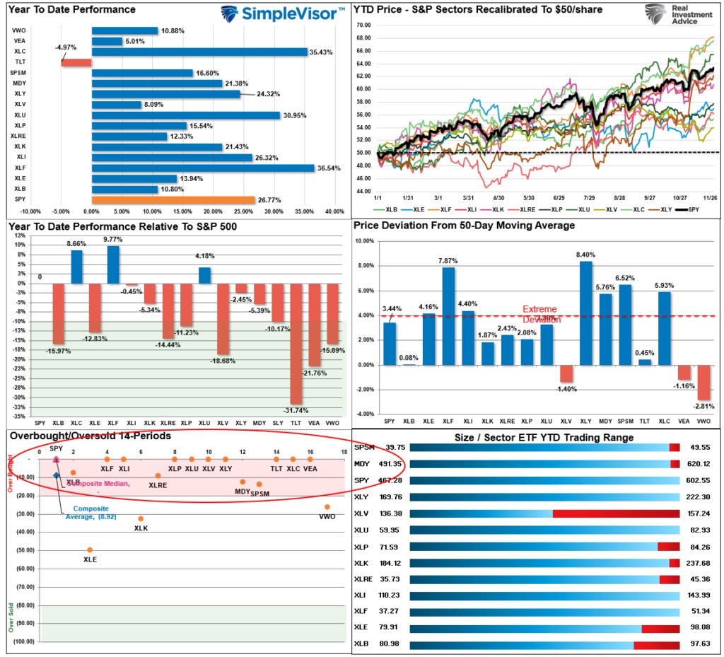 Last week, we noted that Energy, Financials, Real Estate, Staples, and Mid-Caps are overbought, so a rotation to Bonds and Healthcare this coming week would be unsurprising. That occurred this past week. However, while Energy and Technology lagged, the rest of the market pushed further into overbought territory. Nonetheless, as noted at the outset of this week’s report, the end of November tends to trade bullishly, so the move was unsurprising. The good news is that the first 5-days of December tend to also be bullish for stocks, so we suggest remaining weighted to equities. However, with the market overbought, expect some sloppy trading heading into Mutual Fund distributions next week.