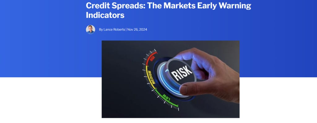 “While there are several credit spreads to monitor, the high-yield (or junk bond) spread versus Treasury yields is considered the most reliable. That spread has been a reliable predictor of market corrections and bear markets. The high-yield bond market consists of debt issued by companies with lower credit ratings. Such makes them more vulnerable to economic slowdowns. As such, when investors become concerned about economic prospects, they demand significantly higher returns to hold these riskier bonds. When that happens, the spreads widen warning of increasing risks.